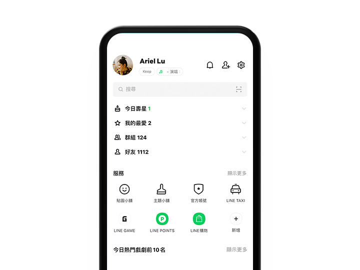 可以快速连结 LINE 的各种服务,包含贴图等多样的内容资讯。